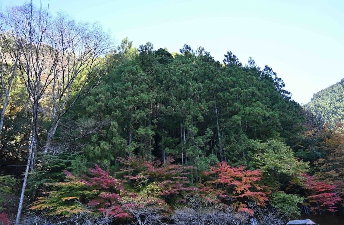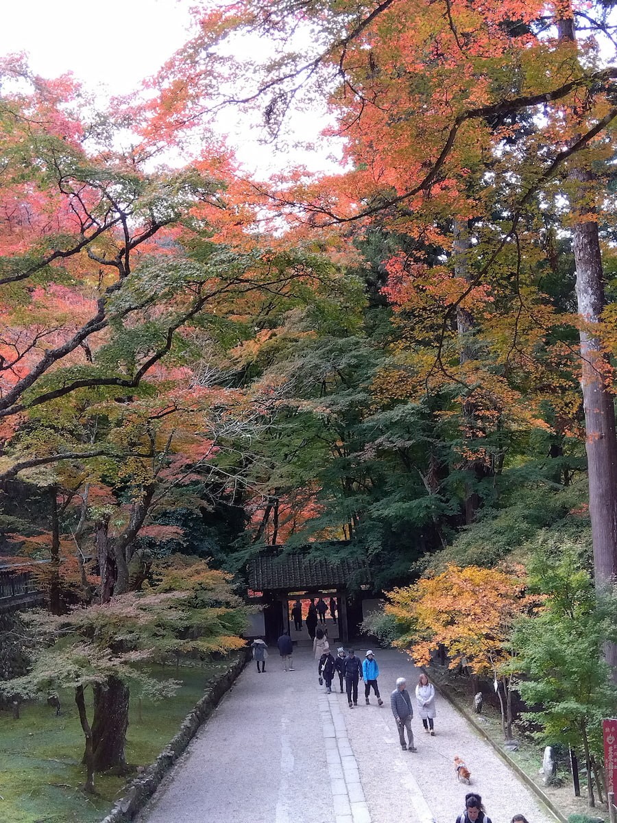 山門越しに 巴川沿いの遊歩道のもみじが 真っ赤に燃えているようでした。 |