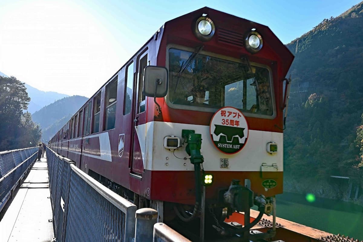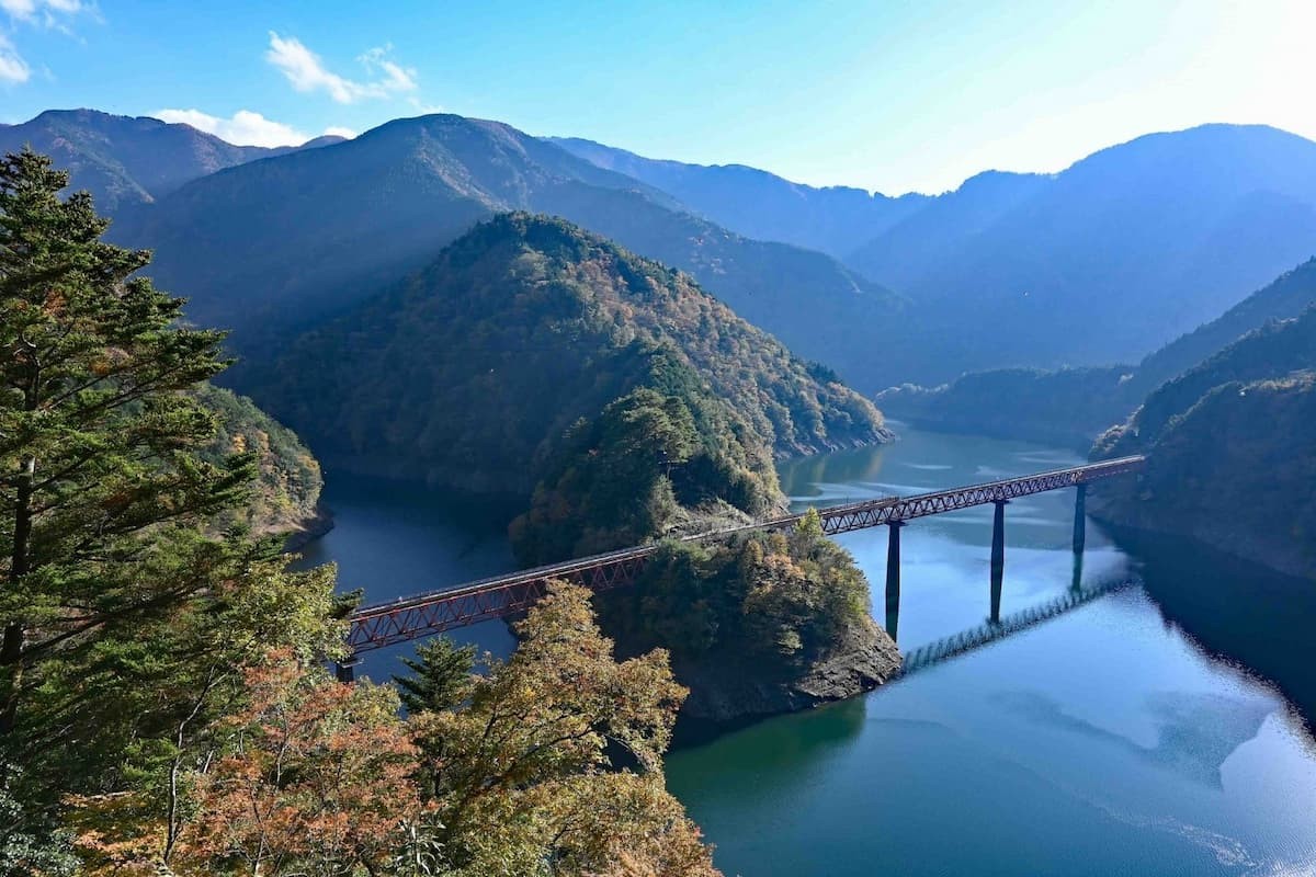 橋のたもとで順番待ちの長い行列。一時間待ちとの事で急な階段を後戻りしました。 飛龍橋からの景色を楽しみます。 長島ダム湖に架かる美しい鉄橋レインボーブリッジブリッジです。 半島のように突き出した場所に奥大井湖上駅があります。 |